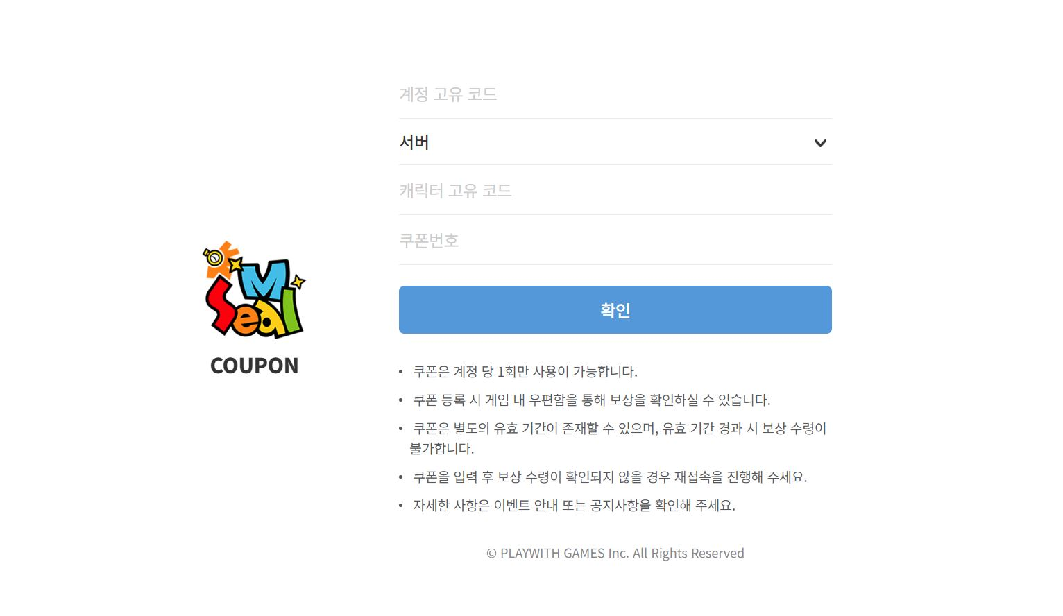 STEP 3. 보상을 수령할 계정의 고유 코드와 서버, 캐릭터 고유 코드, 쿠폰 번호를 입력 후 [확인] 버튼을 클릭하여 보상을 수령합니다.