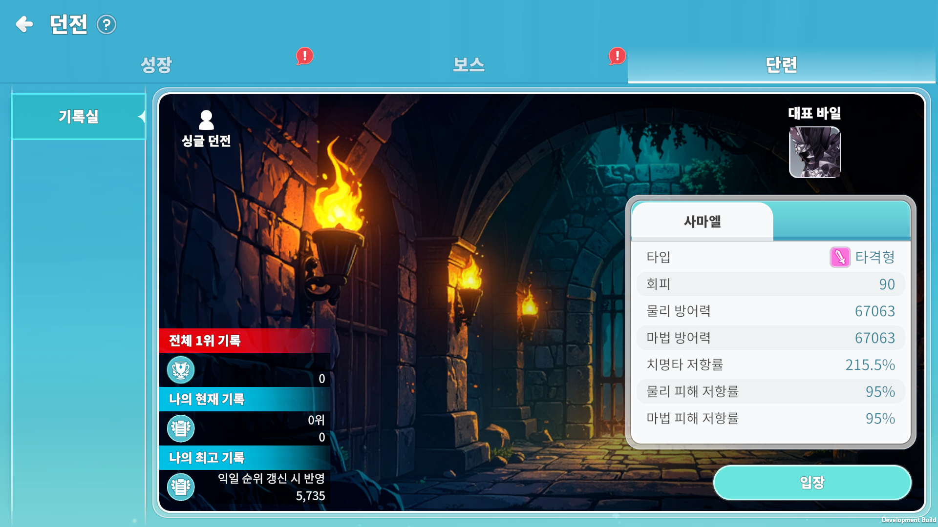 던전 메뉴에서 ‘단련’ 탭으로 이동하면 기록실에 입장하실 수 있습니다.