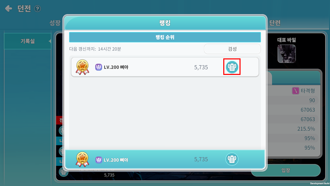 - 랭킹 UI에서 직업별 랭킹을 확인할 수 있으며, 명단의 기록 아이콘을 누르면 해당 모험가의 대미지 정보를 알 수 있습니다.